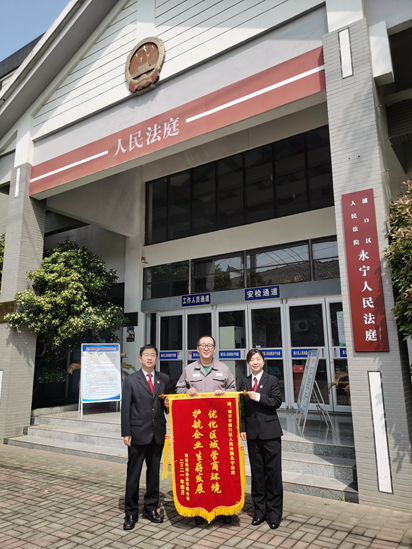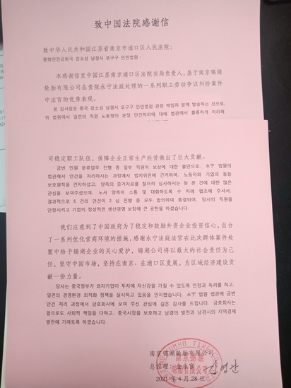 4月28日,南京锦湖轮胎公司向我院永宁法庭赠送锦旗并向浦口法院致感谢信,对浦口法院永宁法庭及时公正高效解决劳动争议纠纷,既保障了企业良性健康发展、也维护了劳动者的合法权益表示感谢。2020年该公司因受疫情影响经营状况发生重大变化与员工解除劳动合同关系,部分员工对于补偿金额不满,企业与员工协商未果,引发纠纷。