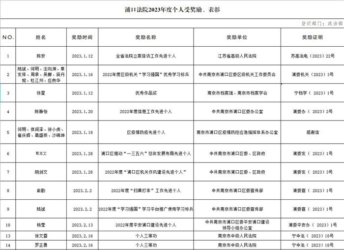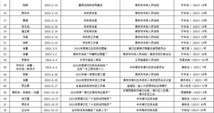 浦口法院2023年度个人受奖励、表彰
