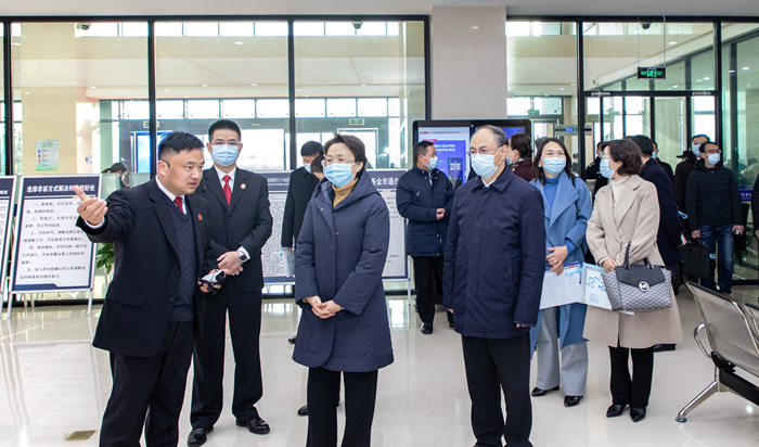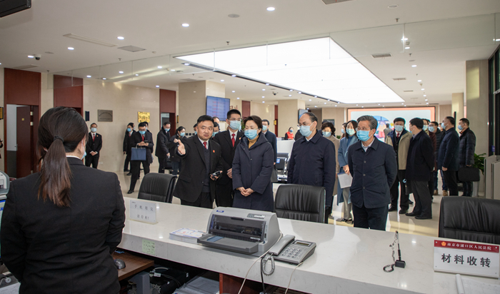 王燕文、夏道虎一行首先考察了浦口法院诉讼服务中心,浦口法院党组成员、审判委员会专职委员何明就一站式多元解纷和诉讼服务体系建设作了详细介绍,王燕文在跨域立案窗口向工作人员详细了解工作开展情况。
