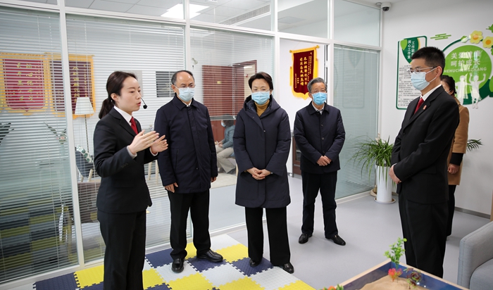 随后考察了“润心工作室”,少年家事庭庭长徐馨介绍了工作室2021年度的建设情况和工作成效。浦口法院探索融合“司法+心理”模式,在少年家事审判中全流程引入心理疏导,设立由心理咨询师和法官、法官助理、书记员共同组成的“润心工作室”,不断倾注对未成年人司法保护的爱心与责任,打造以心理疏导教育为内核的专业化未成年人司法保护体系,切实维护未成年人权益和社会家庭稳定。