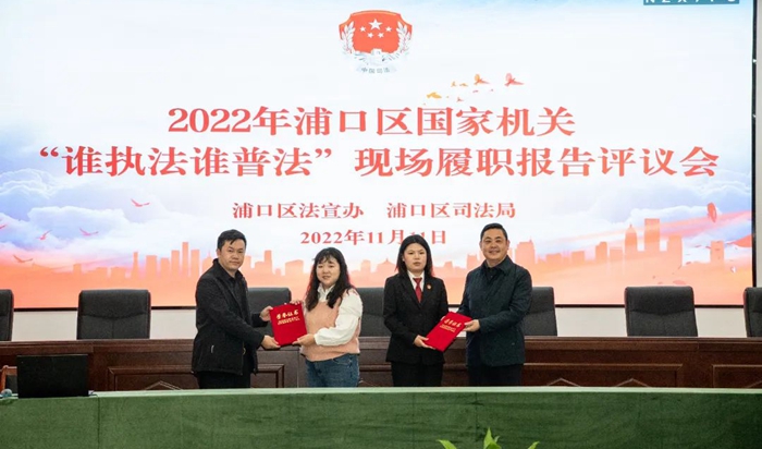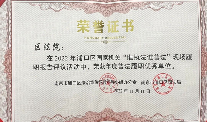 11月11日,在2022年浦口区国家机关“谁执法谁普法”现场履职报告评议活动中浦口法院荣获年度普法履职优秀单位。