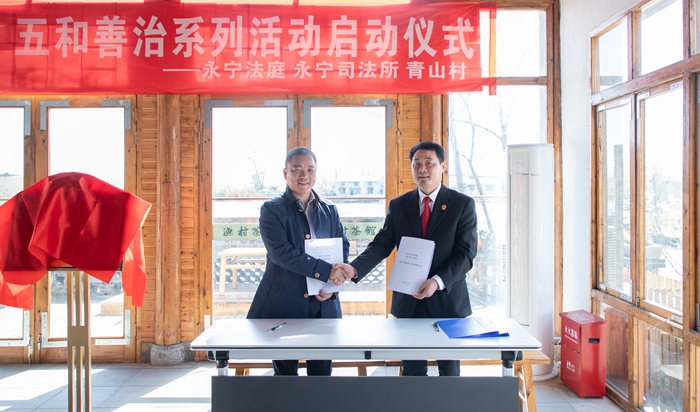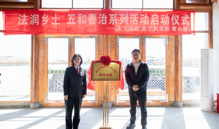 活动中,浦口法院党组书记、院长陈海英,永宁街道党工委副书记、办事处主任徐春明共同为青山村“融合法庭”揭牌。浦口法院党组成员、审判委员会专职委员徐小虎,永宁街道党工委政法委员、办事处副主任张国林共同签署《发展“枫桥经验”院街共建协议》。