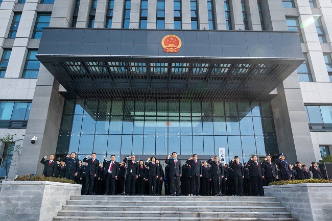 院党组书记、院长陈高峰带领全体干警进行宪法宣誓。