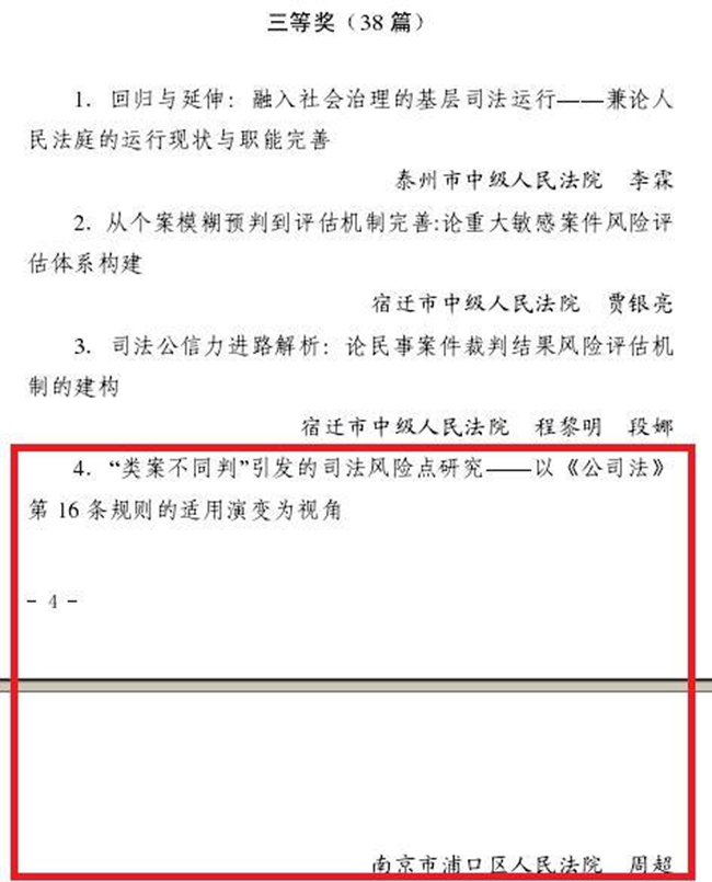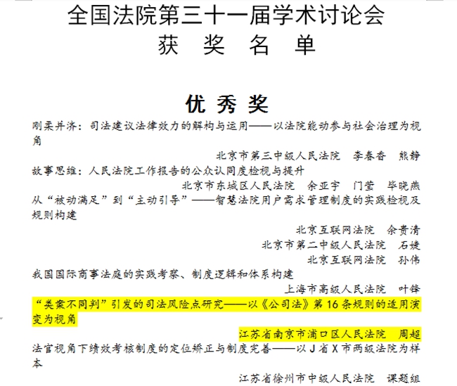 浦口法院周超同志撰写的论文《“类案不同判”引发的司法风险点研究——以《公司法》第16条规则的适用演变为视角》荣获全国优秀奖、全省三等奖。