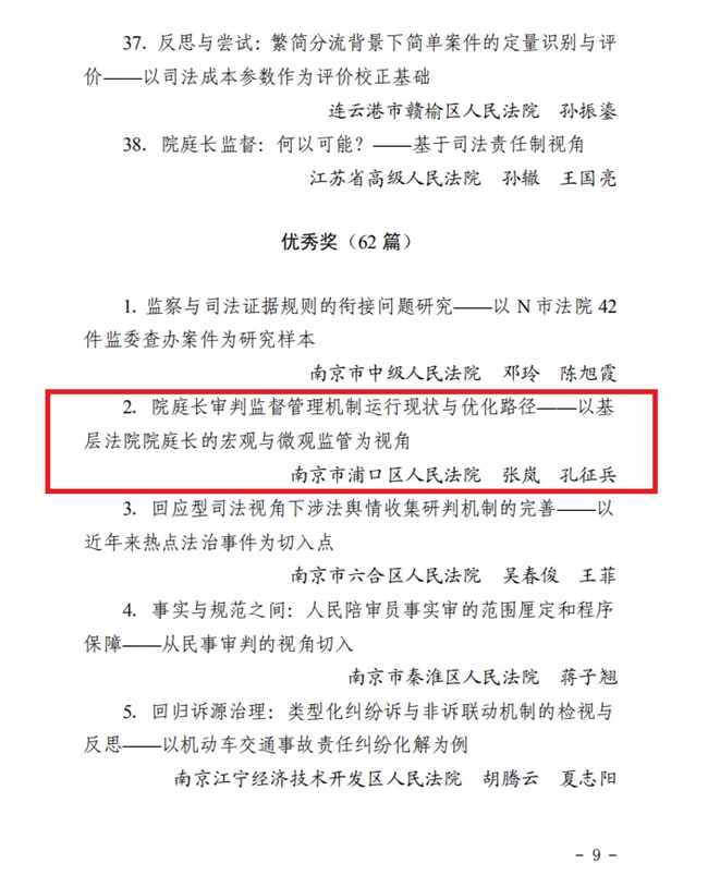 张岚、孔征兵同志撰写的论文《院庭长审判监督管理机制运行现状与优化路径——以基层法院院庭长的宏观与微观监管为视角》荣获全省法院优秀奖。