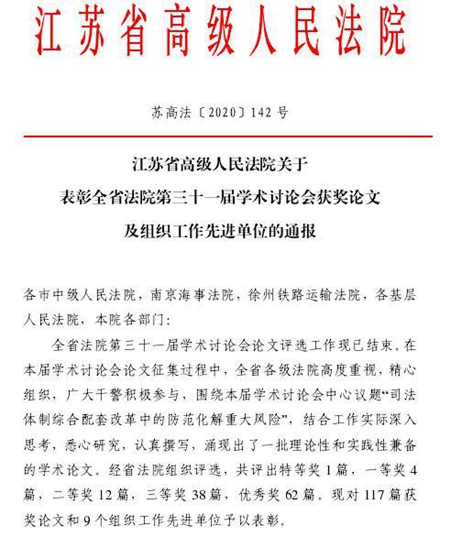 7月21日,江苏省高级人民法院表彰全省法院第三十一届学术讨论会获奖论文及组织工作先进单位,浦口法院2篇学术论文获奖。