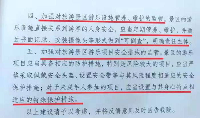 5月31日,浦口法院向区文化和旅游局发送司法建议书,针对近年来审理的旅游景区内发生的人身损害赔偿案件,特别是涉未成年人案件中所反映的旅游景区共性问题,向行政主管部门提出建议,加强对旅游景区娱乐项目设置、安全警示标识设置、工作人员安全生产培训、游乐设施维护、游乐项目安全保护措施等方面的监管,督促旅游景区充分考虑未成年游客的身心特点,设置适当的娱乐项目,采取充足的保护措施,保障游客人身安全,维护未成年人身心健康。