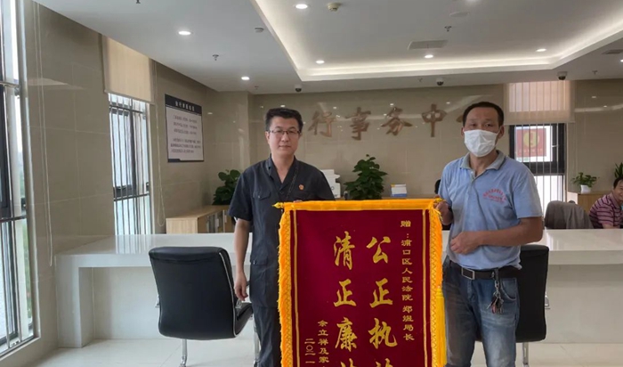 7月14日,申请执行人余某某将一面写有“公正执法,清正廉洁”的锦旗送到浦口法院执行局,感谢郑煜法官及执行团队秉公执法、心系群众。