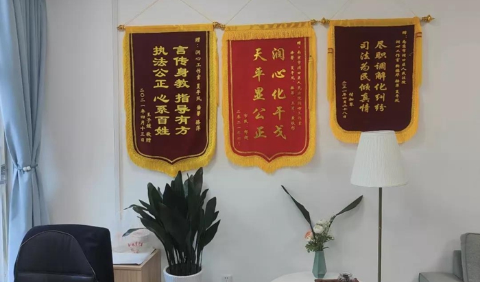 工作室的贴心服务迎来的是群众的认可与信任,墙上的一面面锦旗暖人心,其中两面由一起案件中的原告和被告分别赠送。