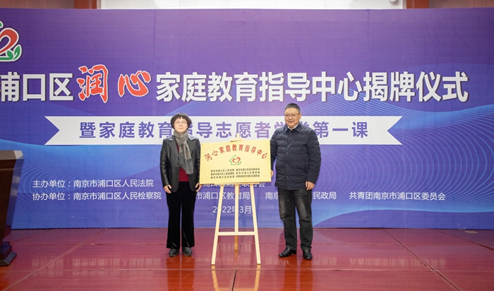 南京市中级人民法院副院长史俊、南京市妇女联合会一级调研员丁颖为浦口区润心家庭教育指导中心揭牌。