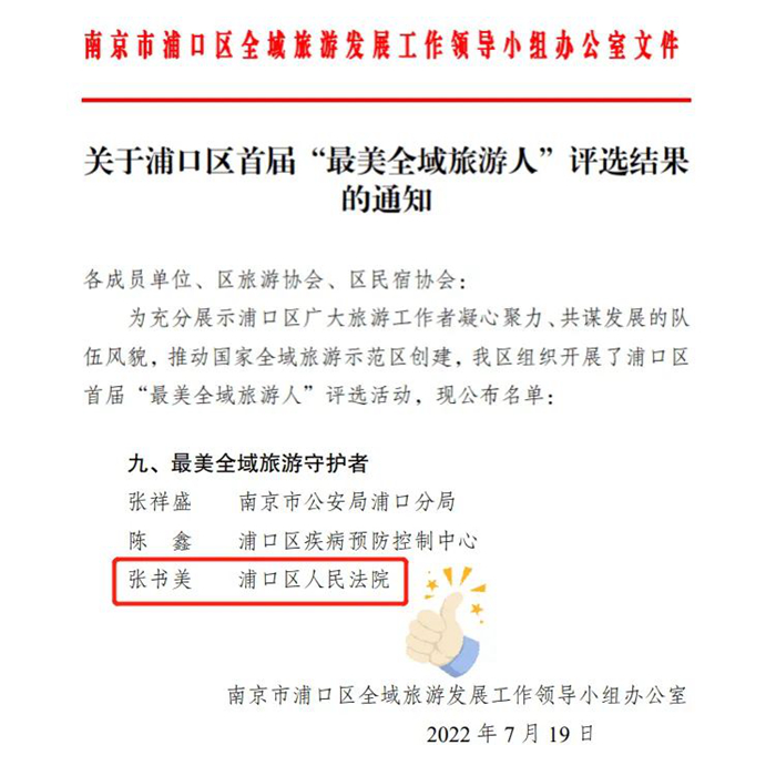 浦口区首届“最美全域旅游人”评选活动结果新鲜出炉,来自浦口区人民法院的张书美获评“最美全域旅游守护者”。