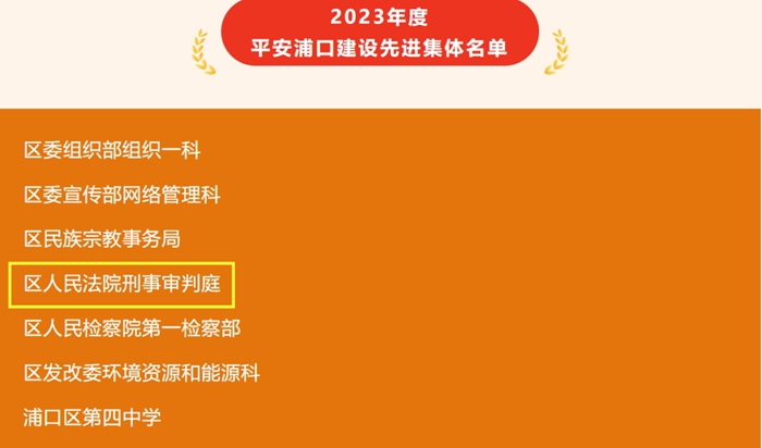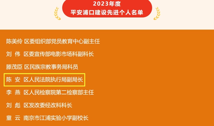 近日,2023年度平安浦口建设先进集体和先进个人公布,浦口法院刑事审判庭获平安浦口建设先进集体,浦口法院执行局副局长陈安获平安浦口建设先进个人。