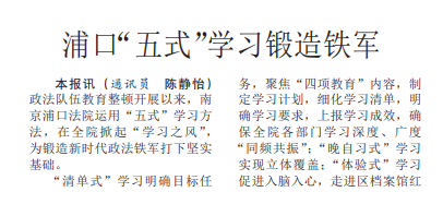 本报讯(通讯员 陈静怡)政法队伍教育整顿开展以来,南京浦口法院运用“五式”学习方法,在全院掀起“学习之风”,为锻造新时代政法铁军打下坚实基础。