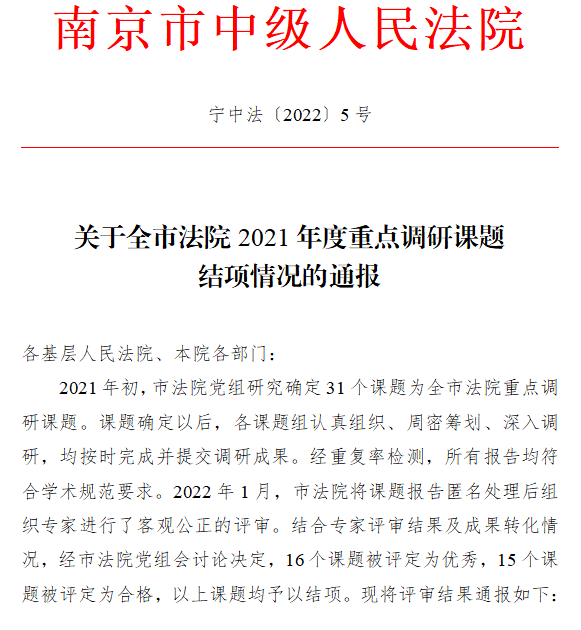 1月20日,浦口法院破产课题组撰写的论文在全市法院2021年度重点调研课题中获评优秀