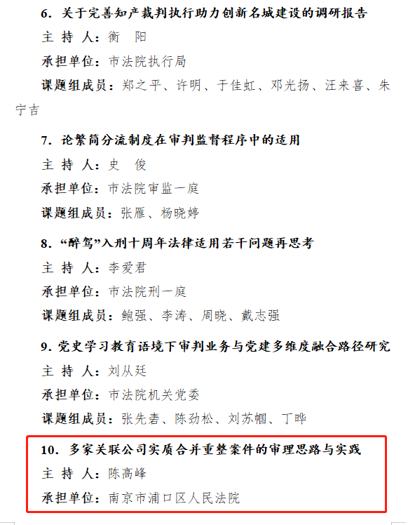 本次调研共有31个课题入选重点课题,基层法院共有5个课题获评优秀。本课题从理论基础和审判实践出发,分析现有实践案例,为多家关联企业实质合并重整的提供可行性方法和新思路。