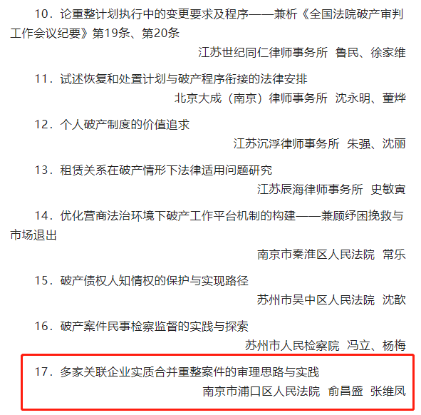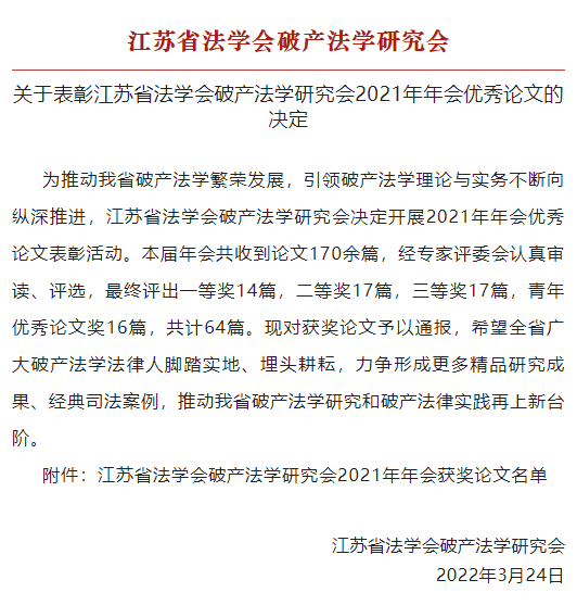近日,浦口法院破产课题组撰写的论文《多家关联企业实质合并重整案件的审理思想与实践》在江苏省法学会破产法学研究会2021年年会获三等奖。本次年会共收到论文170余篇,获奖文章48篇。